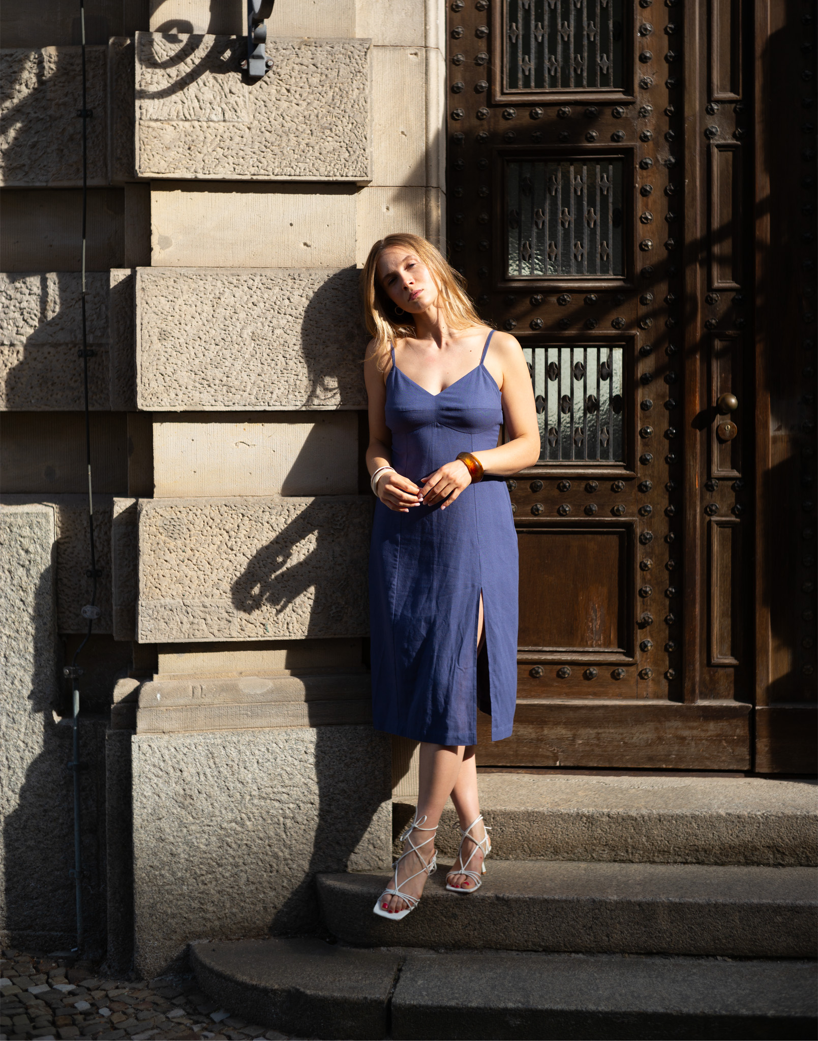 This midi length dress blends soft femininity with a modern silhouette. Made from a breathable linen-rayon blend, it drapes naturally over the body without feeling restrictive. Sculpted bodice front adds definition, while a front slit introduces movement and a subtle reveal. Adjustable straps – both vertical and horizontal – offer a customizable fit. Finished with a discreet back zipper for a seamless look and ease of wear.