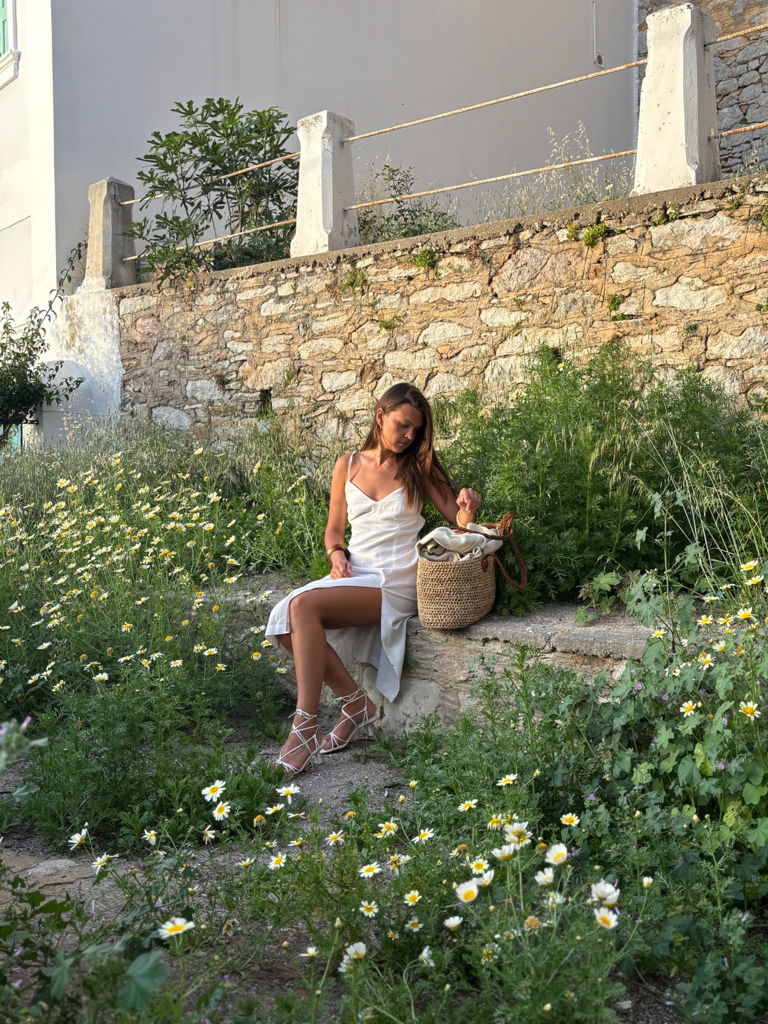 This midi length dress blends soft femininity with a modern silhouette. Made from a breathable linen-rayon blend, it drapes naturally over the body without feeling restrictive. Sculpted bodice front adds definition, while a front slit introduces movement and a subtle reveal. Adjustable straps – both vertical and horizontal – offer a customizable fit. Finished with a discreet back zipper for a seamless look and ease of wear.
